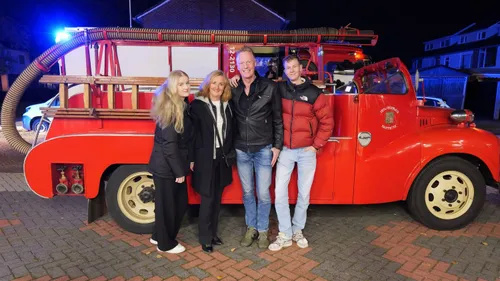 een kolonne van een oude “Austin brandweerauto ” en de brandweervoertuigen van