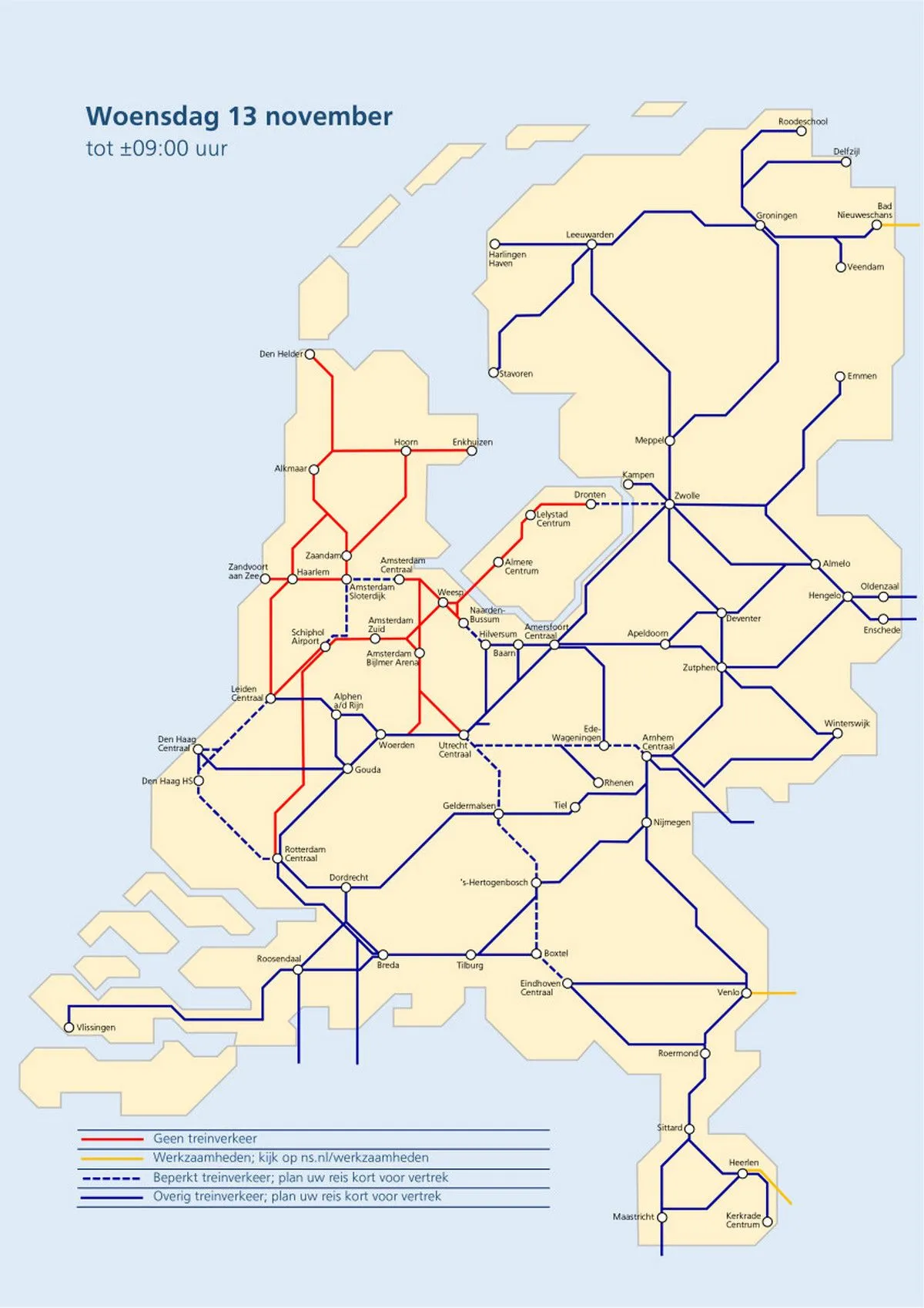 Ook rijden er geen treinen tussen Leiden, Schiphol en Haarlem. Op de Hogesnelheidslijn (HSL) is geen treinverkeer mogelijk tussen Rotterdam, Schiphol en Amsterdam.