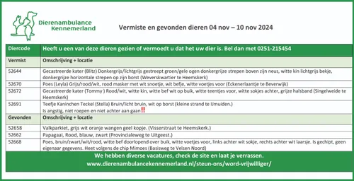 gemeld bij of gevonden door Stichting Dierenambulance Kennemerland: