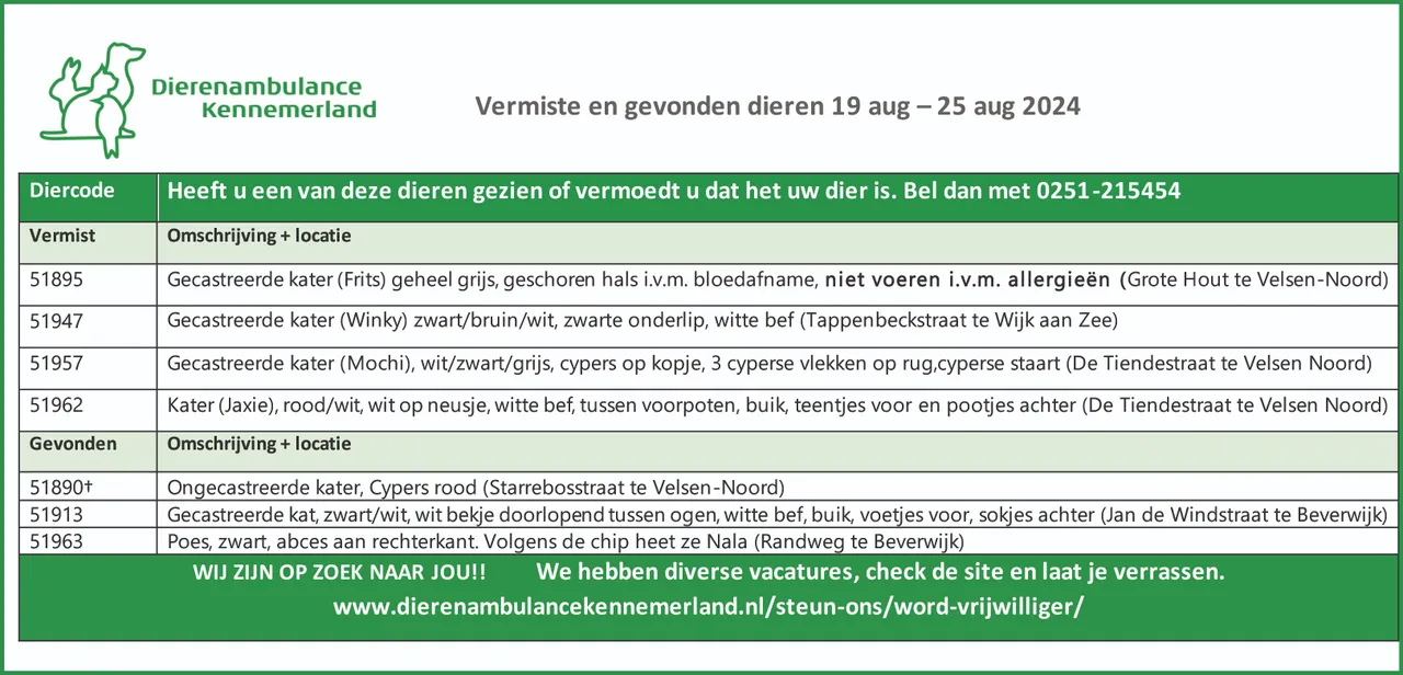 Iedere week publiceert Nieuws.nl de gevonden en vermiste dieren in en rond Beverwijk, Heemskerk, Castricum en Uitgeest op basis van de gegevens van Stichting Dierenambulance Kennemerland en Stichting Amivedi.