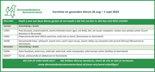 Iedere week publiceert Nieuws.nl de gevonden en vermiste dieren in en rond Beverwijk, Heemskerk, Castricum en Uitgeest op basis van de gegevens van Stichting Dierenambulance Kennemerland en Stichting Amivedi.