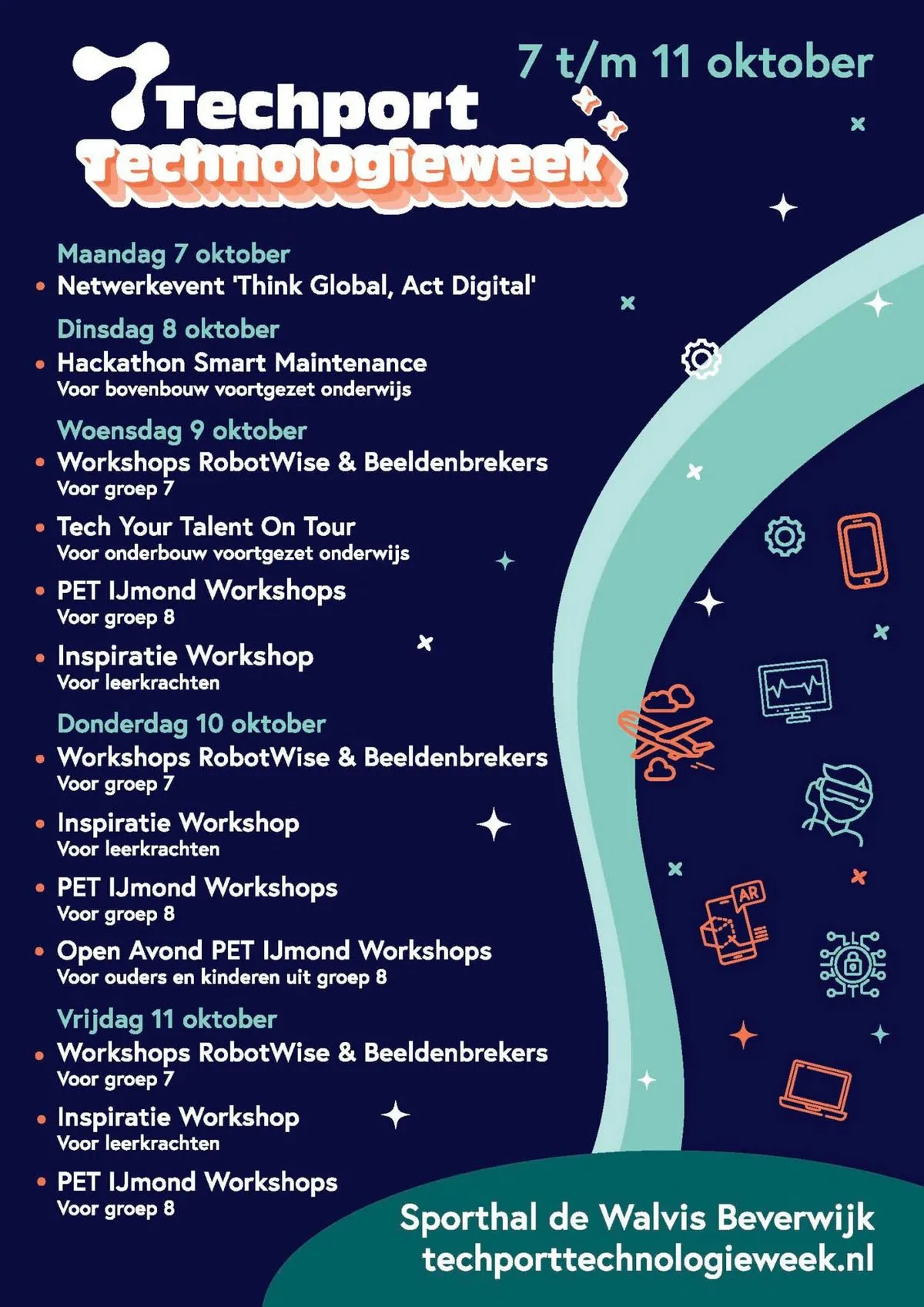 Tijdens het speciale ouder & kind-avondprogramma op donderdag 10 oktober van 19.00 – 21.00 uur op de Techport Technologieweek kunnen ouders/verzorgers en kinderen samen nog keer meedoen aan de workshops van PET-IJmond). Maar ook samen oriënteren op een vervolgopleiding in de techniek èn een breed scala aan beroepen ontdekken in de zorg, bouw, voeding, media, de energietransitie en nog veel meer!