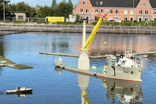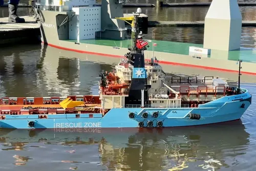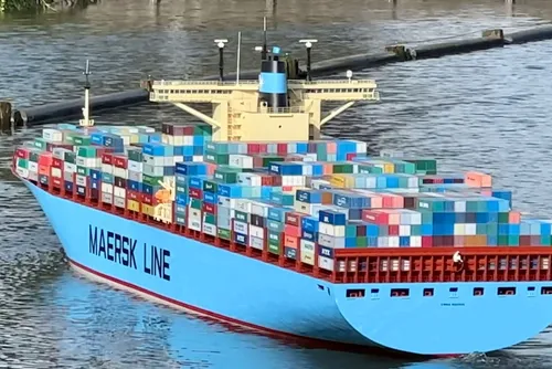wegende model van een Maersk containerschip dat in twee delen vervoerd werd en