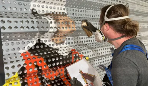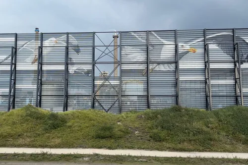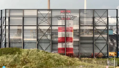 Er is al heel wat discussie gevoerd over het windscherm dat Tata Steel heeft geplaatst. Het doel is om ervoor te zorgen dat de wind geen vat meer krijgt op de kolen- en ertsopslag op het terrein van de staalfabriek en daardoor minder stof in de omgeving terecht komt. Volop discussie over de effectiviteit van het scherm. Veel omwonenden hadden liever een overkapping gezien. Maar volgens deskundigen voldoet het scherm waarvoor uiteindelijk is gekozen. En los van de effectiviteit, lijkt dat esthetische gezien geen verkeerde keuze, want de resultante mag gezien worden. En daar heeft Kunstenaarscollectief Spatzuiver een belangrijke rol in gespeeld.