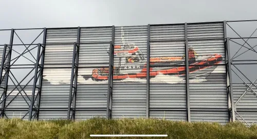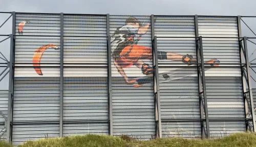 WIJK AAN ZEE / VELSEN NOORD - Met de komst van het kilometerlange en 18 meter hoge windscherm rondom de grondstofopslagen van Tata Steel heeft Wijk aan Zee een soort eigen  ‘East Side Gallery’ gekregen. Dat dankzij Kunstenaarscollectief Spatzuiver, dat het windscherm heeft voorzien van levensgrote schilderingen.